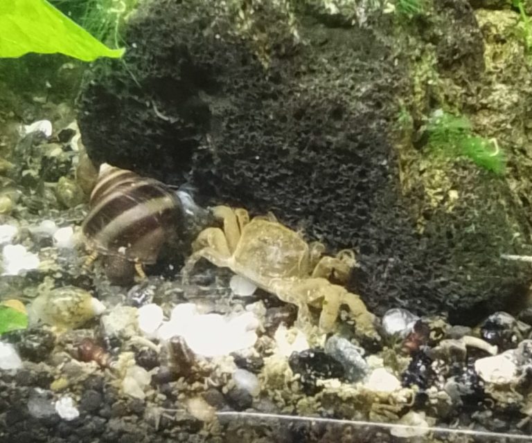 Vorsicht bei Schnecken: Kleinere Schnecken wie Posthornschnecken werden sehr wahrscheinlich gefressen. Die Krabben nehmen gut Garnelenfutter und Spirulinapulver an.